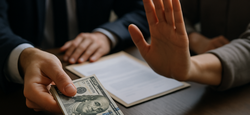 По мнению экспертов, предметом взятки могут быть не только денежные суммы, но и имущество, услуги или обещания будущих выгод. В качестве примеров указываются злоупотребление служебным положением — например, использование техники или транспорта организации в личных целях — и ценность услуги, когда, по сути, даже небольшая вещь становится условием для получения выгодных действий. В перечне фигурируют также услуги и обещания: приглашение на ужин, содействие в трудоустройстве родственников или иные устные договорённости по принципу «ты мне — я тебе». При этом отмечается, что взяткодатель по закону не обязан быть должностным лицом — роль дающего может принадлежать как сотруднику, так и внешнему контрагенту.